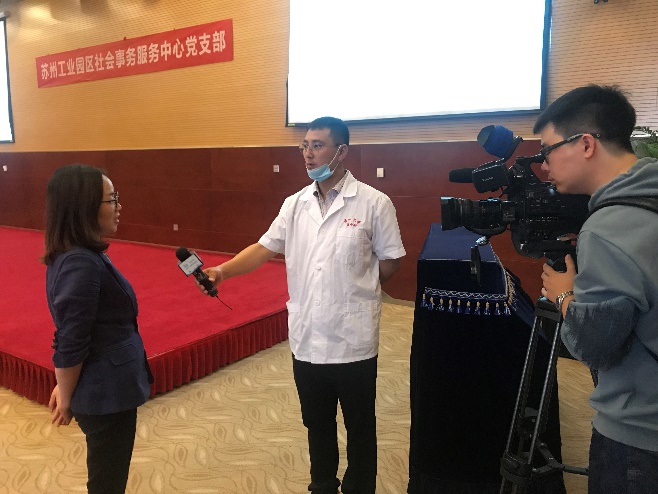 医学部教工第三党支部党员马彬同志,作为此次活动的多方联络人,协助整场活动的顺利进行。苏州电视台新闻清晰度栏目也对本场活动全程给予了采访和报道,并于5月9日晚苏州电视台新闻清晰度栏目播出,引起了广泛的社会关注和反响。