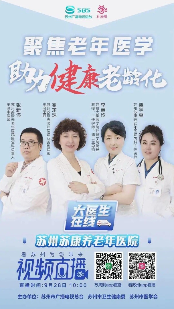 9月28日,在苏州市第一家上规模老年病综合医院正式营业之际,由苏州广播电视总台、苏州市卫生健康委员会、苏州市医学会联合打造的权威名医互动直播《大医生在线》也如期而至。本期节目聚焦老年医学,从老年病的预防、治疗、康复、护理等视角,助力健康老龄化,真正为苏州长者的幸福生活加码。苏州大学苏州医学院护理学院院长李惠玲应邀出席节目。