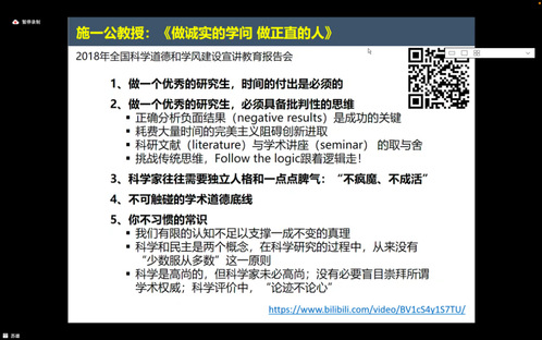 最后,苏雄教授以施一公教授2018年在全国科学道德和学风建设宣讲教育报告会上的讲话《做诚实的学问 做正直的人》为结束。他送给同学们四句话“做你喜欢的事;任何时候都不晚;井蛙不可语海,夏虫不可语冰;保持一颗好奇心”,以此勉励同学们努力成为一名优秀的研究生。