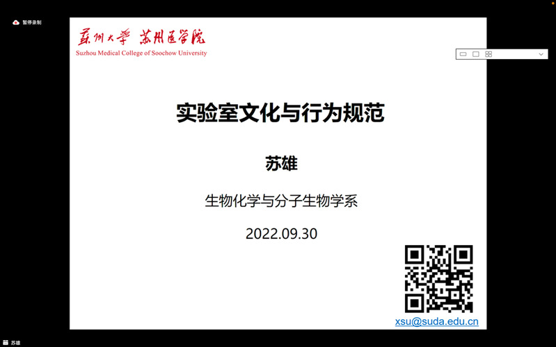 为了帮助新生更好地融入实验室和课题组的学习、工作氛围,在轻松愉悦中开启人生的又一段求学之旅。9月30日下午,苏州医学院邀请特聘教授、博士生导师苏雄教授为2022级研究生作实验室文化与行为规范讲座,400余名研究生新生通过线上方式参加学习。讲座由党工委副书记吴德建主持。