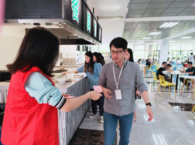 中午11点,党支部党员们来到一期食堂门口。一部分党员进入二楼餐厅,在餐盘回收处向“光盘”的同学发放用餐优惠券,优惠券上印有“珍惜粮食,拒绝浪费”字样。“谁知盘中餐,粒粒皆辛苦。”餐饮浪费现象,不只是个人消费习惯问题,更是事关国家粮食安全的大问题。党的十八大以来,在党中央的大力倡导和有力推动下,“光盘行动”广泛开展,“舌尖上的浪费”现象有所改观,特别是群众反映强烈的公款餐饮浪费行为得到有效遏制。一粒米、一滴油,看起来不起眼,却事关国计民生。开展“光盘行动”,不仅要把餐桌上的食物利用好,更要把讲究适度、健康、责任的消费理念深植于人们心中,唤起全社会的爱粮节粮意识,形成厉行节约、反对浪费的社会风尚。“历览前贤国与家,成由勤俭败由奢。”艰苦奋斗是永不过时的“传家宝”,我们要端牢中国饭碗,就应时时刻刻珍惜来之不易的“一粥一饭”,让人间烟火气更有幸福味道。向“光盘”的同学发放优惠券,也正是为了鼓励宣传“不浪费”的优良行为。