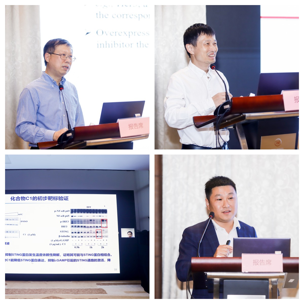 药物学家们则探索和开发疾病相关的蛋白翻译后修饰的可药化调控和治疗实体,如丁克研究员探索了“非催化功能调控—蛋白激酶药物研究的新方向”,富有成效地开发了已批准上市的激酶抑制剂,近期又利用PROTAC技术结合非催化功能域调控的概念,创新性实现了对激酶EGFR和Axl的选择性和有效性可药化干预,为靶向不同激酶的不同适应症药物研发提供了新的药物设计策略;孙宏斌教授围绕cGAS-STING 信号通路的可药性调控,分别从直接靶向STING蛋白以及靶向STING棕榈酰化域两种方式,获得了体内有效的STING抑制剂候选药物,有望为临床多种自身免疫性疾病的治疗带来福音;杨志谋教授通过磷酸酶水解的方法,使载有药物分子的多肽骨架形成特殊功能的水凝胶,并模拟蛋白的折叠,从而在体内发挥比蛋白药物更有效的药理活性,为多肽药物的研发提供新的思路;杨凯教授研究放疗与肿瘤免疫治疗的关系,开发了基于生物材料的肿瘤放射免疫治疗体系,利用所含核素的放射性治疗激活肿瘤免疫反应,有效抑制原位瘤和转移瘤的生长,有望实现临床转化。