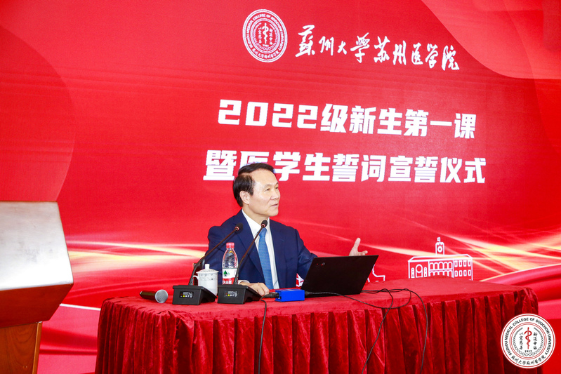 中国工程院院士、医学院院长詹启敏为2022级新生上了第一课,詹院长回顾了他自己为学为师的心路历程。“今年是我走出苏州医学院的校门至今已有40年了,当初选择医学和教师作为职业,而今已成为终身不能放弃的事业。”他用一个个生动的故事讲述了对学医的热爱与追求、希望新生们从“祁通中西,以宏慈善”的医学前辈身上不断汲取精神力量,传承医者品格。他建议大家多动脑、多思考,建立科学的、正确的人生观、价值观和世界观,有自己的信仰和梦想,崇尚英雄,积极发挥正能量。詹院长动情地说,“好医生就像美丽的天使一样,具备一对矫健的翅膀,左边的翅膀是一流的能为患者解除病痛的高超医术,右边的翅膀是一流的医学人文精神和道德情操,只有拥有了这样一对坚实的翅膀,有全心全意为人民服务和救死扶伤的人道主义奉献精神,才能在医学专业的道路上飞得更高更远。”
