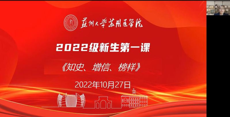 新学期,新气象,新征程。为了加强新生思想政治教育,也为了激发同学们学习科研热情,2022年10月27日晚,党工委书记钱福良为苏州大学苏州医学院2022级全体新生讲授以“知史、增信、榜样”为题的新生第一课。本次活动以线上授课形式开展,党工委副书记吴德建主持。