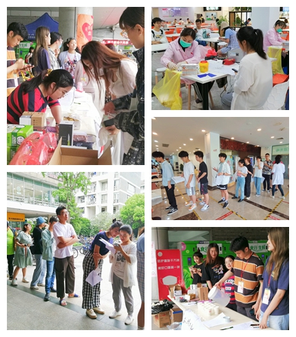 献血活动正式开始之前,志愿者们便早早地来到一期食堂,紧锣密鼓地做好前期准备。中午11点30分,活动正式开始。前来献血的学生们慢慢排起长龙,在志愿者和血站工作人员的引导下井井有条地开始登记、体检、采血化验。人越来越多,天气也愈发炎热,但前来献血的同学们都耐心地等待着。红会的志愿者们在各自的岗位上认真地工作,及时地为献血的同学提供电解质水,为他们补充营养,以减少献血可能引起的不适状况。