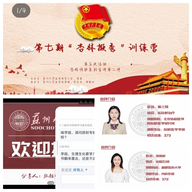 2021年6月14日下午14点,医学部团校第七期杏林撷秀训练营“杏林传胪”系列宣讲第二讲顺利开展。本次活动有幸邀请到了医学部两位优秀的毕业班同学与学员们进行考研经验分享,他们分别是16级临床医学专业的张雅昕同学和16级放射治疗专业的喻滟翔同学。