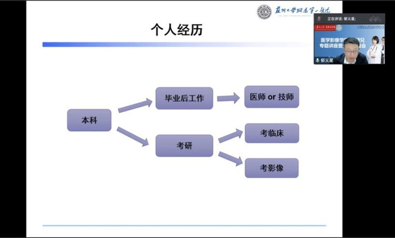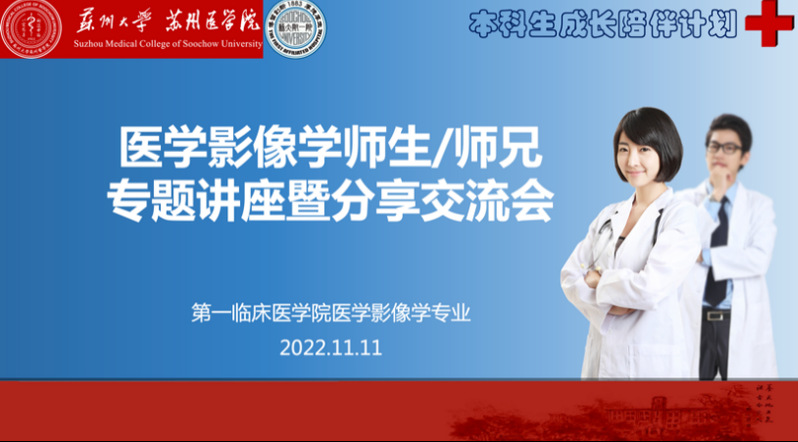 拓展学科认识、巩固专业思想,11月11日晚,在第一临床医学院的关心支持下,一场生动而丰富的线上专业分享会获得了师生赞誉,本次活动由医学影像学成长陪伴团队举办,得到了苏州大学第一临床医学院副院长胡春洪的关心支持。活动邀请了苏州大学附一院放射科郁义星副主任医师,以及苏大医学影像专业硕博在读师兄:2016级娄嘉豪、2015级梁广财、2012级周永杰。苏州医学院学工办老师、2021级陪伴团队的导师、导生以及医学影像学专业相关老师出席活动,讲座由成长陪伴德政导师、介入诊断学教研室杨超副主任医师主持。充分发挥了朋辈引导作用,体现了医学精神代代相承的传统,只有在专业上精益求精,不懈奋斗,方能实现健康中国的远景目标。