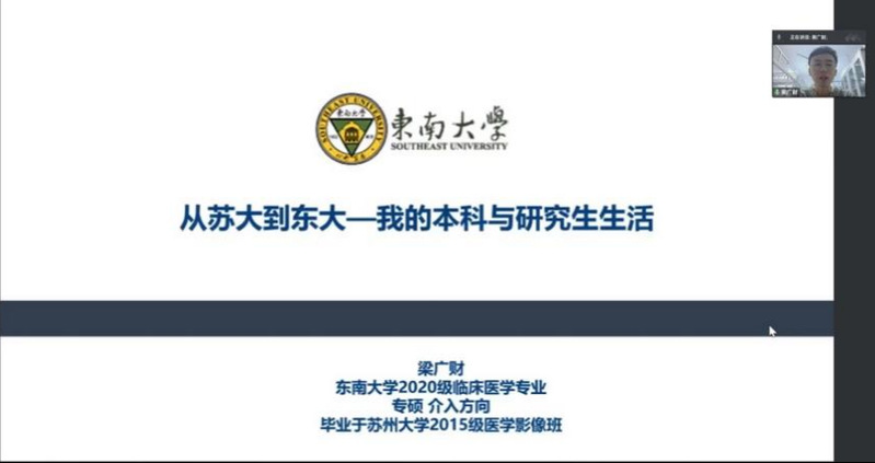 2015级梁广财师兄的分享主题是《从苏大到东大—我的本科与研究生生活》。梁广财现就读于东南大学介入专业,讲座中他回顾了娱乐和学习两不误的本科校园生活、繁忙又充实的苏大附一院实习和考研备战经历,也讲述了正在进行的忙碌上班和科研并重的研究生生活。梁师兄认真记录了每一个阶段的努力和收获、探索与快乐,他积极的心态和热情的生活态度,为成长陪伴团队的成员注入了很多精神能量。