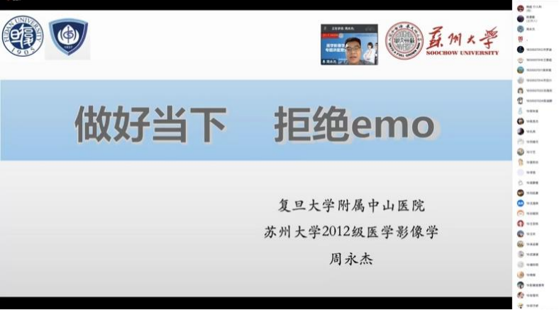 2012级周永杰师兄带来分享经验《做好当下,拒绝emo》。周永杰目前是复旦大学附属中山医院放射介入方向的博士研究生。周师兄为大家带来三个方向的中肯建议:专业学习方面,要稳扎稳打、循序渐进;大学生活方面,多享受集体生活、珍惜同窗情谊;职业发展方面,应当根据未来的学科前景,来选择考研考博的学校和导师。