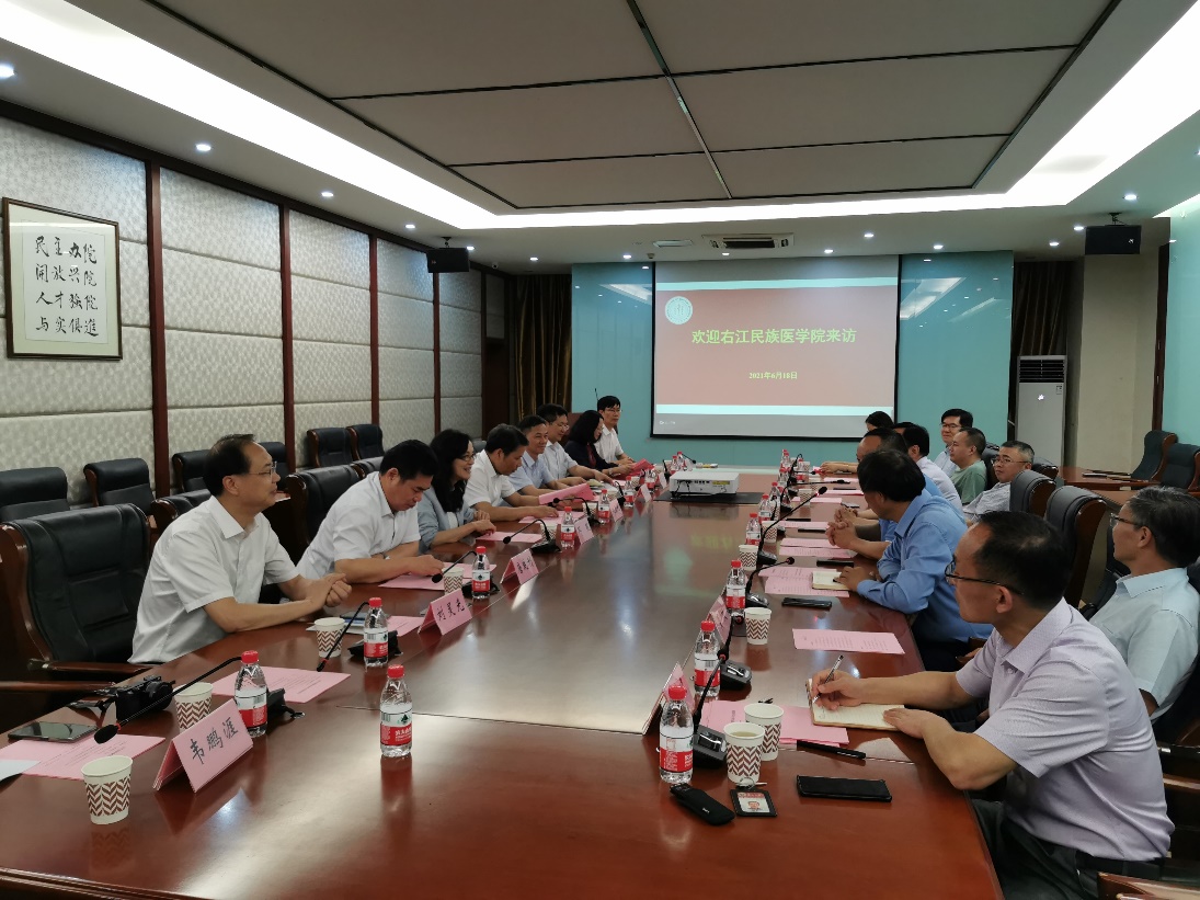 6月18日下午,右江民族医学院党委书记邓砚、院长姚金光带队医学院领导班子一行访问医学部,根据《苏州大学、百色市人民政府、右江民族医学院关于促进百色市妇女儿童健康发展和提升妇幼医疗卫生技术水平合作框架协议》精神,就加强人才培养、学科专业和科技平台建设等合作开展座谈。校党委常委、副校长姚建林,医学部党工委书记邹学海、常务副主任徐广银等学部领导班子成员及各院所主要负责人出席座谈会。会议在医学楼一楼放射医学与防护学院会议室举行,由姚建林副校长主持。