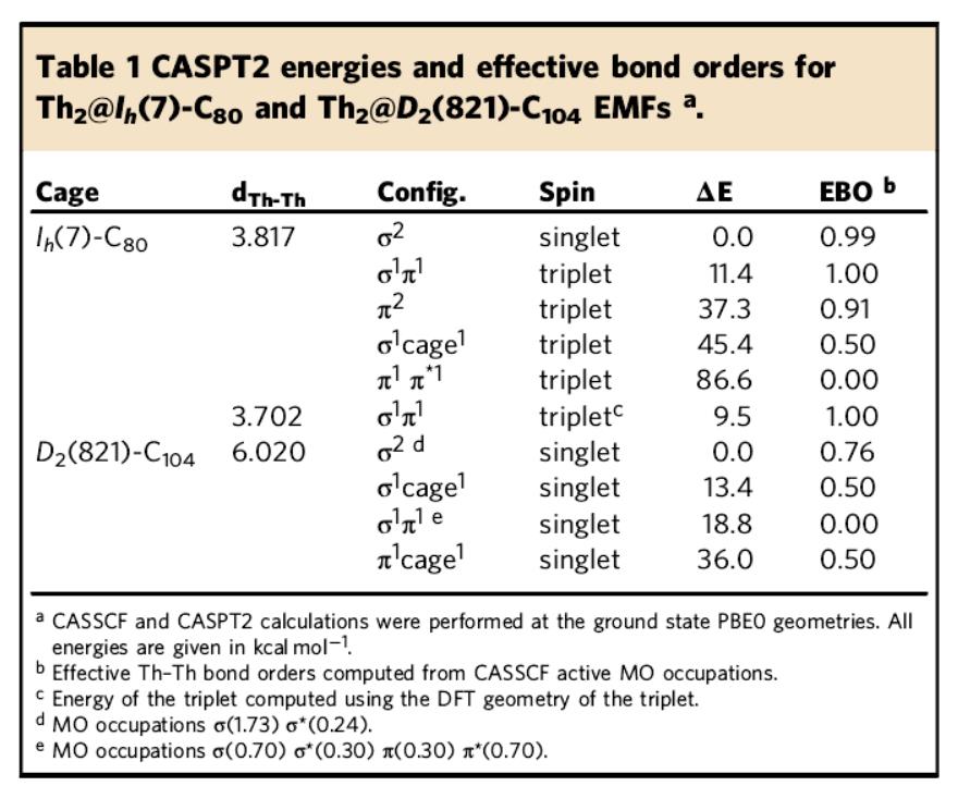 对Th2@Ih(7)-C80中Th-Th键的电子构型分析时发现,Th-Th键为σ2型键,但pi轨道成键也对该键形成有重要贡献,其有效键级(EBO)为0.99。由于客体和碳笼主体之间的六电子转移,Th2单元向碳笼转移一定数量的电子后,剩余两个电子存在于主要由Th的价层轨道形成的分子轨道中,进一步证实了钍离子在低能态时的氧化态为+3。