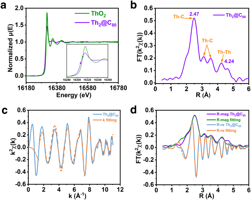 进一步,对Th2@Ih(7)-C80和标准四价钍化合物ThO2进行了X射线吸收谱(XAS)的表征。发现与ThO2(Th4+)相比,Th2@Ih(7)-C80的E0向低能量区偏移了4.7 eV,这表明Ih(7)-C80碳笼内Th的氧化态低于+4,证实了Th价态为+3价;Th2@Ih(7)-C80的χ(R)空间谱图表明,2.47Å处为第一壳层的主要峰为Th-C键的散射路径,与晶体结构分析中钍原子与碳笼上最近的六元环上碳的距离相近;3.11和3.54 Å处的峰对应于第二和第三壳层Th-C键的散射路径,与晶体结构分析中Th-C的平均距离2.90和3.35 Å相对应。而4.24 Å处的强峰代表了第四壳层两个Th原子之间的散射路径。