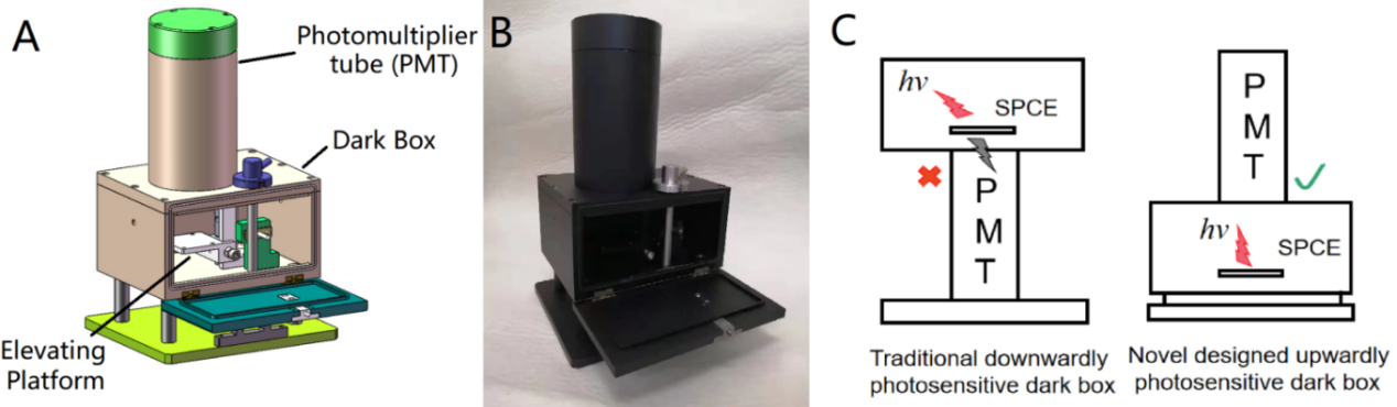 为了达到核应急早期预警,争取宝贵时间,对痕量碘蒸汽的精确监测需要满足快速实时实地的要求。因此,在实际工作中可使用Pdots修饰丝网印刷电极(SPCE)制成成本极低(1~3 RMB)的一次性检测元件,免除了玻碳电极(GCE)的电极打磨、清洗、修饰等复杂的前处理过程。SPCE向上发光的特性决定了适应GCE的传统ECL下采光暗室无法适用(图3C)。因此,该工作设计了配套的便携式上采光暗室(图3A)并制作了样机(图3B),目前该样机正在调试中。除碘蒸汽检测之外,通过配套不同的ECL检测元件,该系统也可推广到其他放射性物质的高灵敏度检测方面,具有广阔的应用前景。