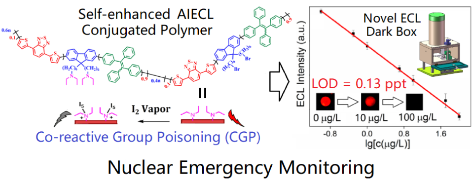 苏州大学放射医学与辐射防护国家重点实验室、放射医学与防护学院华道本教授课题组与南京大学徐静娟教授课题组基于具有聚集诱导电化学发光(AIECL)行为的自增强聚合物点(Pdots)探针,报道了痕量放射性蒸汽的ECL监测工作,并提出了共反应剂中毒(CGP)这一蒸汽检测的新机理。该工作获得了对放射性碘蒸汽低达0.13 ppt的检测限且具有良好选择性,并成功研发了配套的小型化上采光ECL暗室。该系统具有超高灵敏度及仪器小型化、便携化、低成本的优势,充分满足了核应急条件下实时实地的痕量碘监测,有利于核事故的早期预警、相关人员的及时救治及放射性碘污染治理工作。这一成果以“An ultra-highly sensitive and selective self-enhanced AIECL sensor for public security early warning in a nuclear emergency via a co-reactive group poisoning mechanism”为题发表在《Journal of Materials Chemistry A》上(图1)。