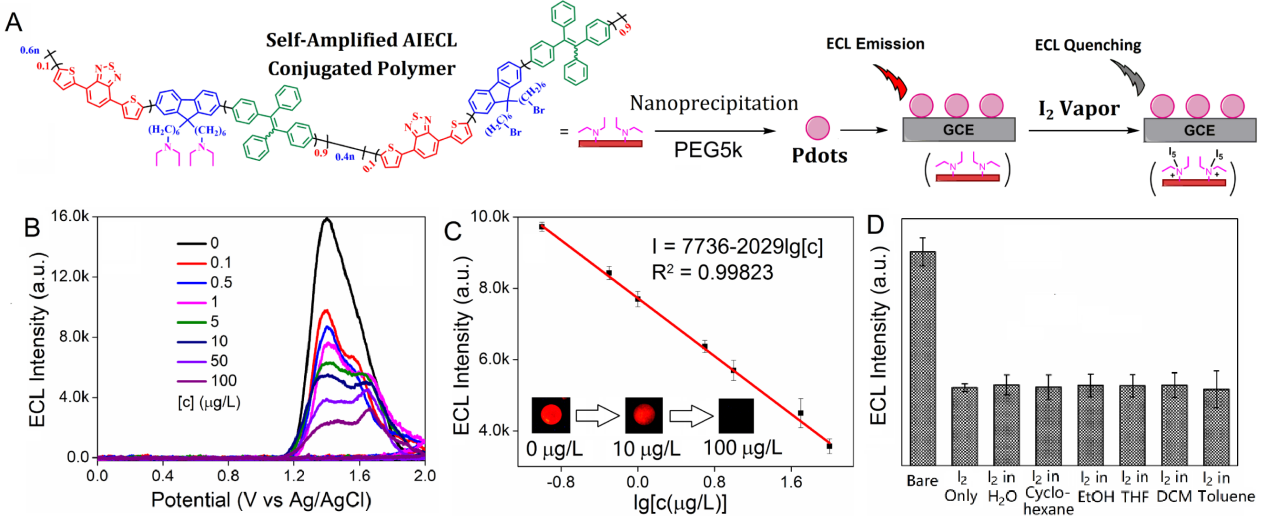 图2.(A)CGP机理示意图;(B)不同浓度碘蒸汽存在下Pdots的ECL强度;(C)碘蒸汽检测线性;(D)Pdots对碘蒸汽的选择性