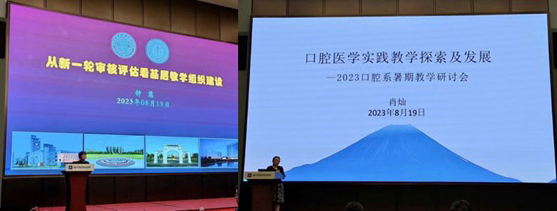 口腔医学系主任肖灿致辞并作教学工作汇报,对2021年换届以来口腔医学系获得的成绩、各项工作的开展情况进行全面详实的汇报。她分享了今年8月在昆明举行的第十八次口腔医学教育学术年会的会议内容、会议精神和教育理念。同时提出“以教学团队为抓手,以课程建设为载体”的教学工作持续改进的具体措施。